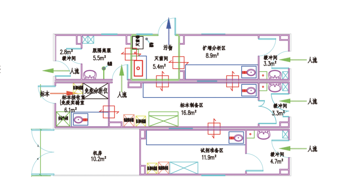 临床基因扩增检验实验室(PCR实验室)设计的核心问题是如何避免污染。因此,实验室的平面布局、空调通风系统设计、气流控制等都是围绕这个核心问题进行的。
