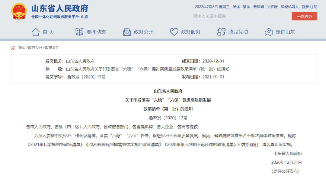 2021年初,山东省政府发布《关于印发落实“六稳”“六保”促进高质量发展政策清单(第一批)的通知》,下称《通知》。
