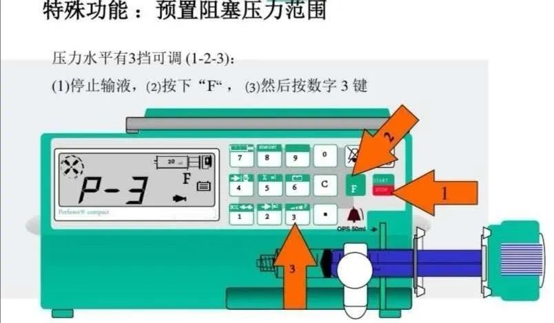 一种注射泵有不同的阻塞压力档位,不同档位有不同的阻塞报警压力值,它直接关系到流速的设定值。