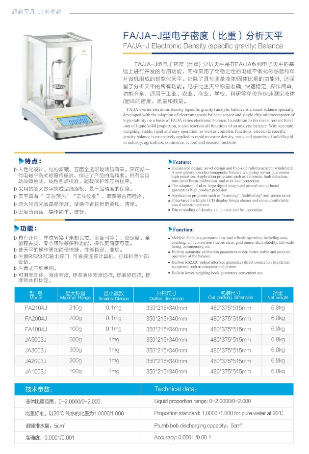 采用高稳定的电磁平衡式传感器和单片微机组成的智能化天平,除了具体测量液体固体比重的功能外,还保留了分析天平的所有功能