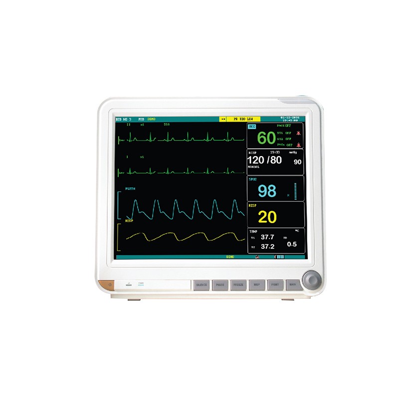 15英寸真彩色、高分辨率液晶屏显示病人的心电波形、呼吸波形、脉搏血氧容积图曲线和呼末二氧化碳波形。带呼末二氧化碳的