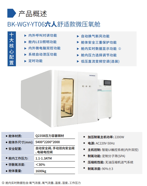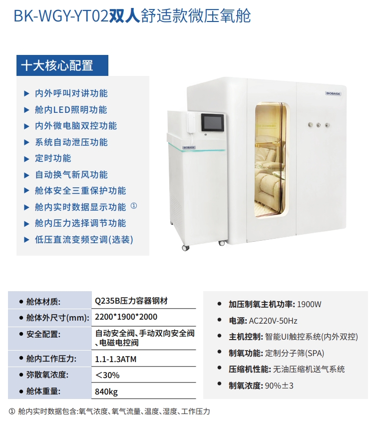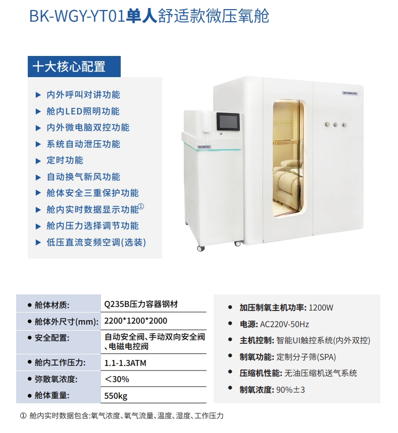 当前位置 > 主页 > 产品专区  > BIOBASE博科系列 > 博科单人舒适款微压氧舱 BK-WGY-YT01高压氧舱