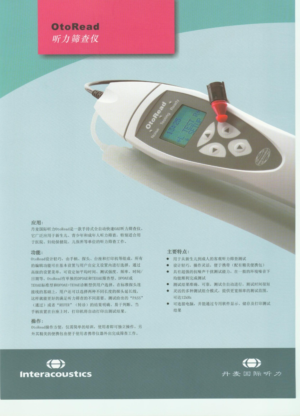 丹麦国际听力OtoRead是一款手持式全自动快速OAE听力筛查仪。它广泛应用于新生儿,青少年和成年人听力筛查,特别适合用于医院,妇幼保健院,儿保所等单位的听力筛查工作。