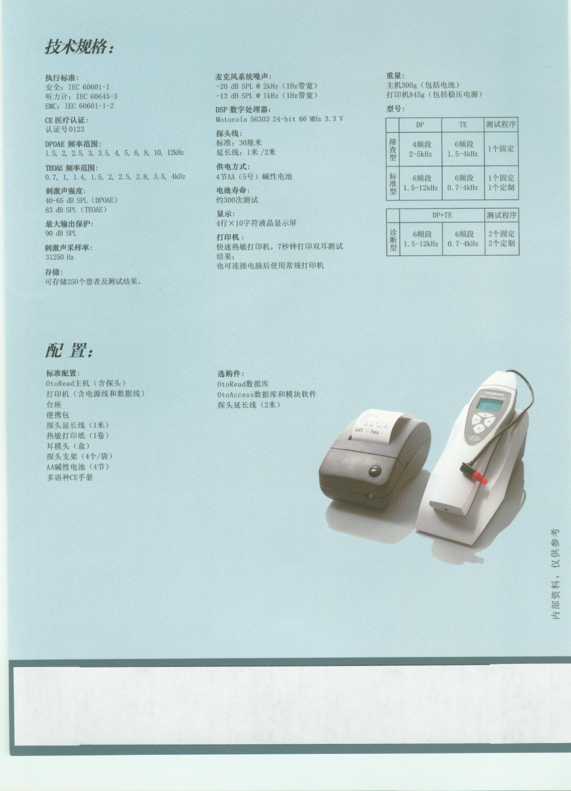 主机;打印机;台座;便携包;探头延长线;热敏打印纸;耳模头;探头支架;AA碱性电池;CE手册