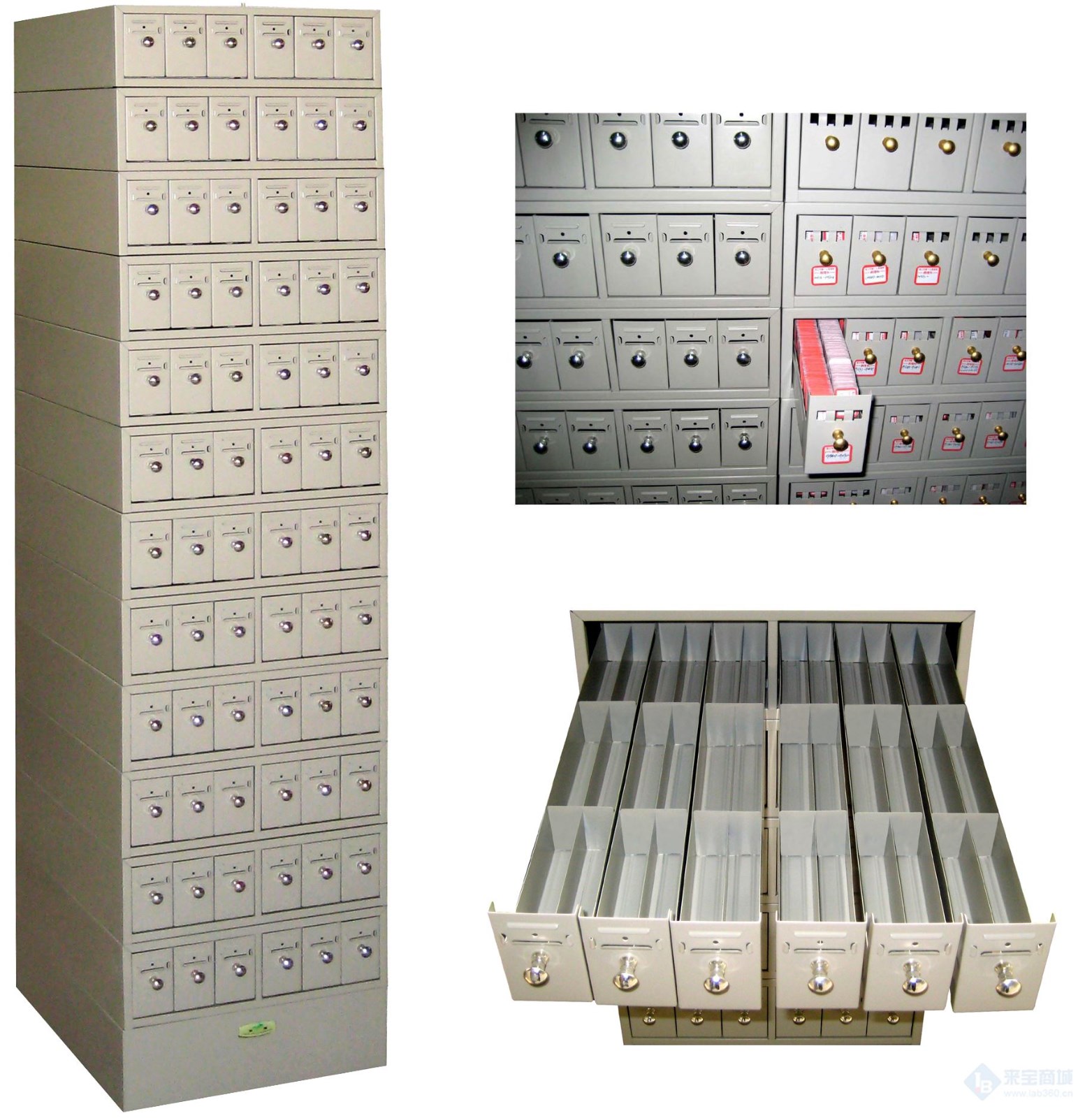 七十二抽(十二节,每节六抽,每节带有连接件,加一底座,每只抽屉可存放标准玻璃切片760片,每套可存放约5.5万片,可负载900公斤),柜体采用优质冷轧板,经数控设备加工成型(保证柜子的平整度与美观度),抽屉:切片专用抽,ABS滑道,ABS涂铬拉手,柜体表面经脱脂除油、表调、锌系磷化、钝化、静电粉未喷塑,插槽:金属开模专用插槽,标鉴槽:一体化冲压成型。