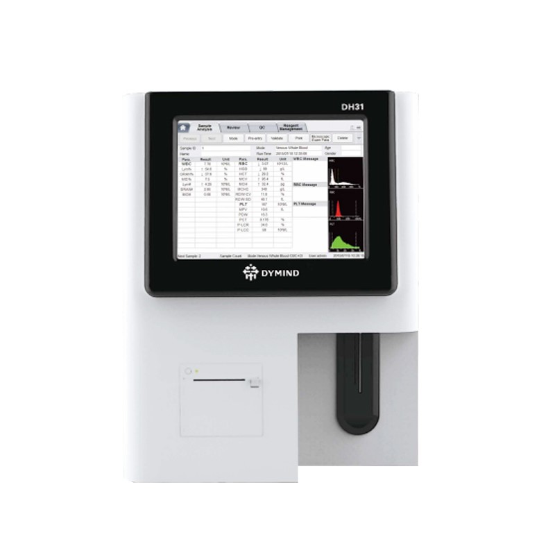 21项参数,报告参数WBC、Lym#、Mid#、Gran#、Lym%、Mid%、Gran%、RBC、HGB、HCT、MCV、MCH、MCHC、RWD-CV、RDW-SD、PLT、MPV、PDW、PCT、P-LCR、P-LCC,3个直方图,红细胞、白细胞、血小板样本异常报警提示 |