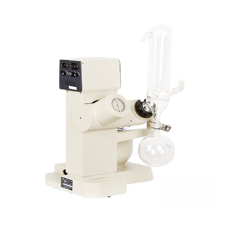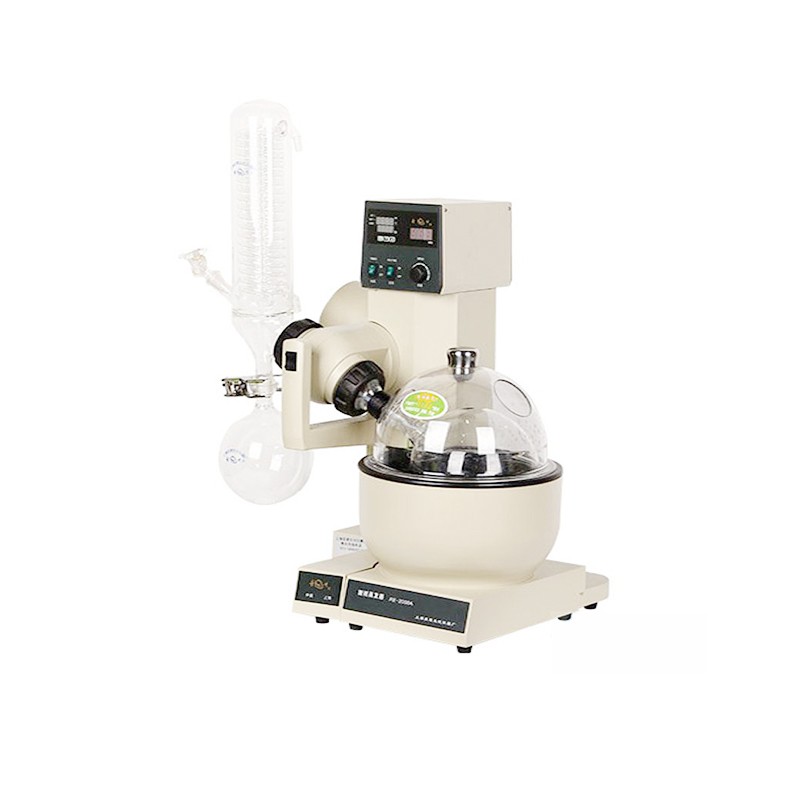 旋转蒸发器是在真空负压条件下,利用恒温加热,薄膜蒸发的原理研制而成。旋转蒸发器用无级调速使玻璃旋转瓶恒速旋转,物料在瓶壁形成大面积均匀薄膜,再由智能恒温水浴锅对旋转瓶均匀加热,在真空条件下高速蒸发,溶媒蒸气经高效玻璃冷凝器冷却,回收于收集瓶。